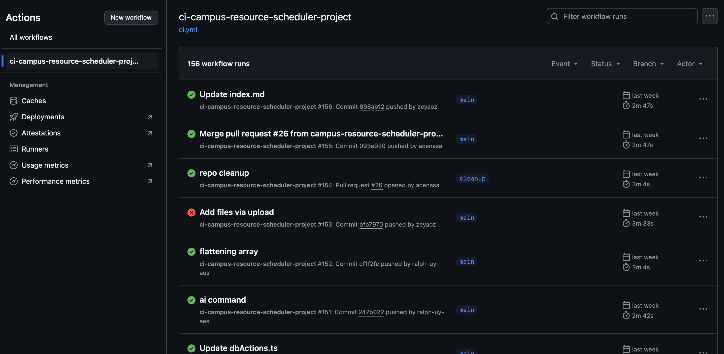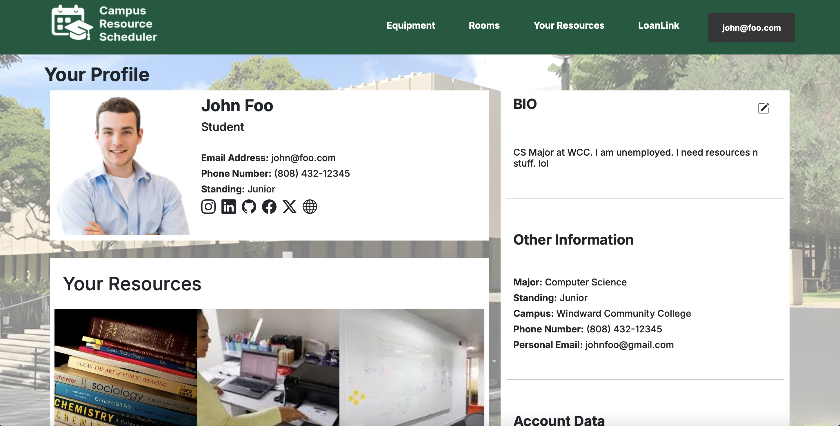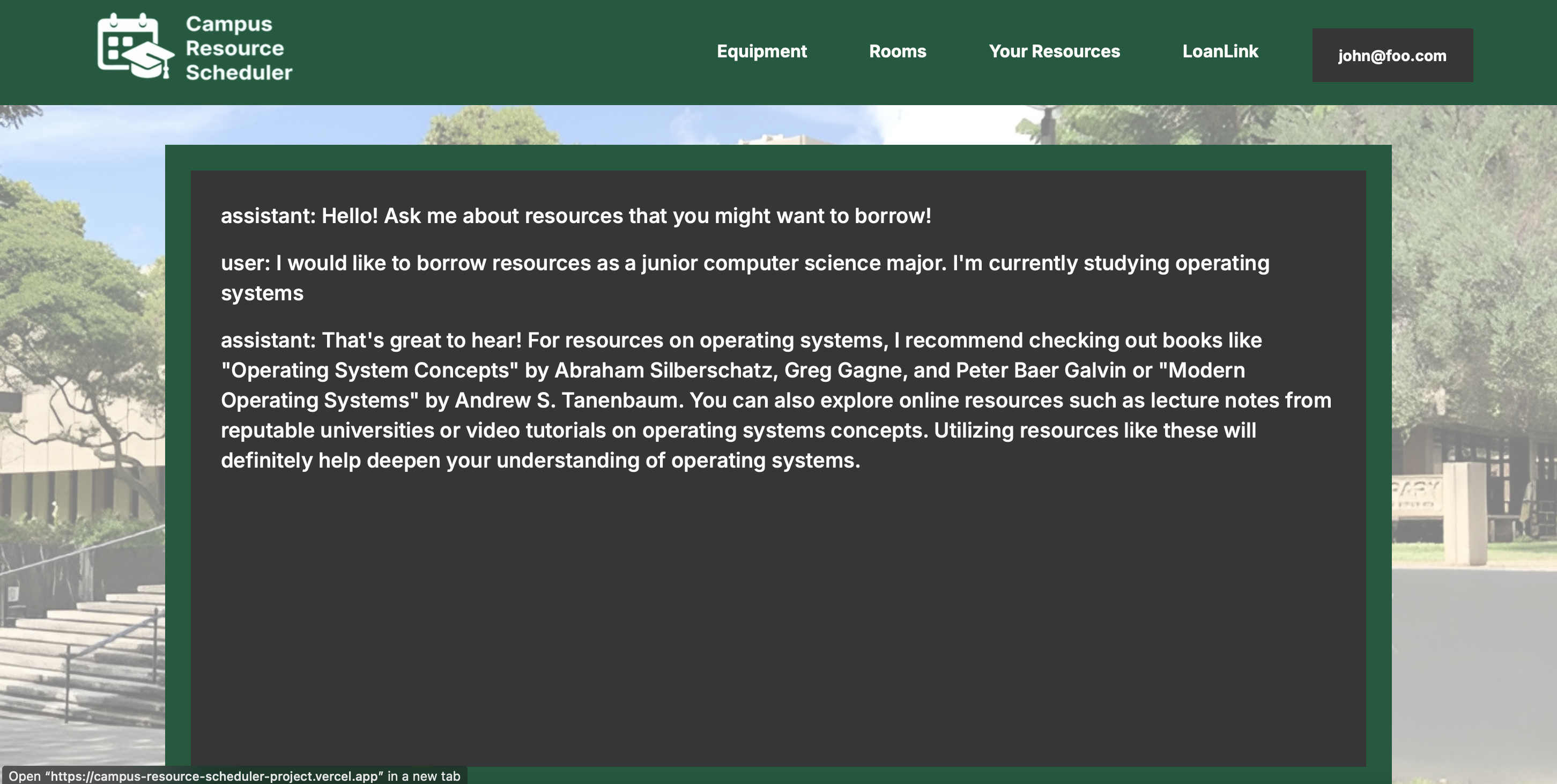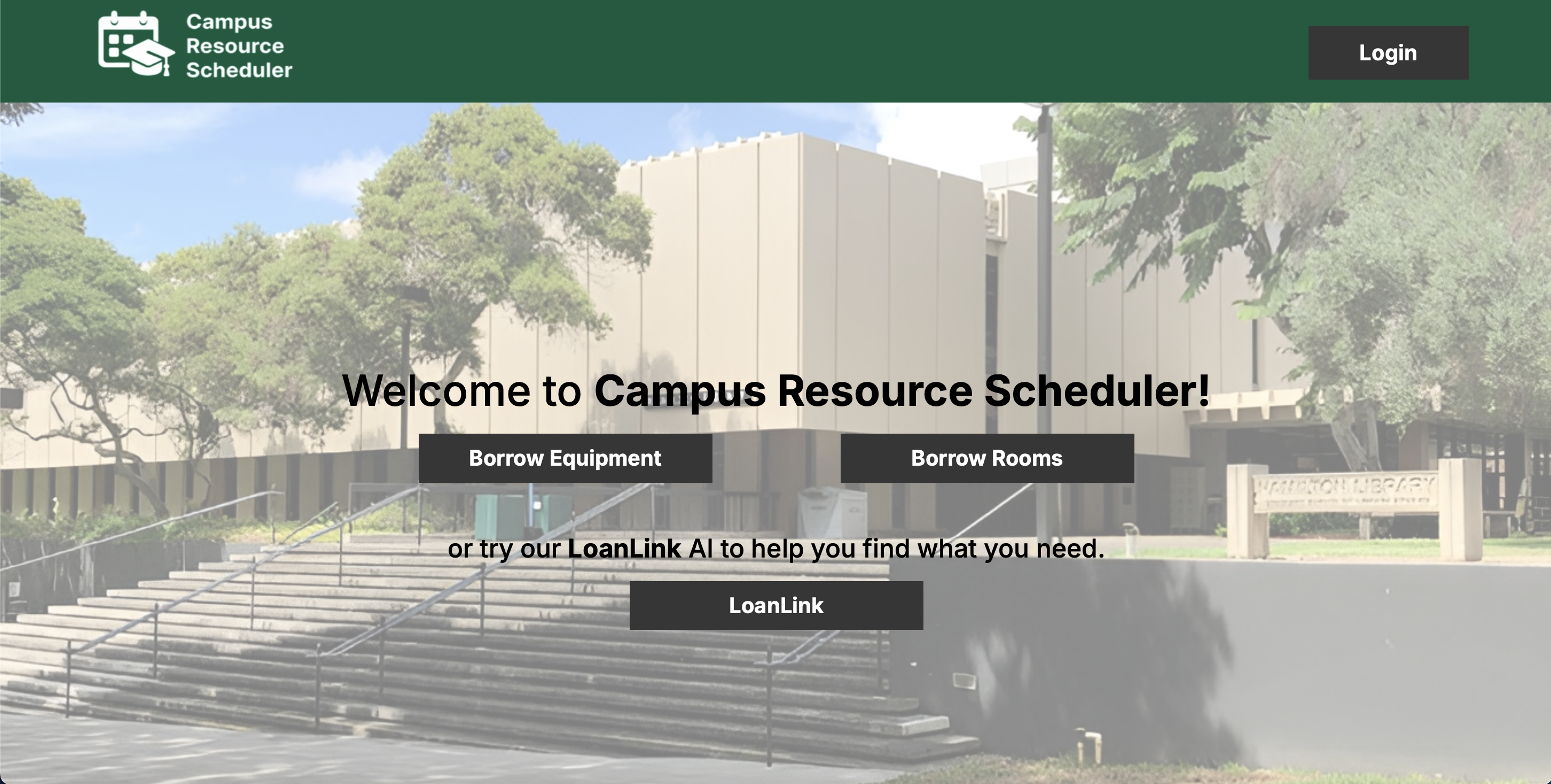 I had the pleasure of working with four other students (Zeyao Zhou, Sungwon Han, Arthur Acenas, Eric Chae) for our final project in ICS 314: Software Engineering. The campus resource scheduler was designed with over 20,000 students in mind. We wanted to improve the efficiency and ease of borrowing and lending campus resources within the university. This process has been notoriously time-consuming and not worth the effort as many students had to navigate through outdated GUIs and processes to borrow campus resources. Furthermore, we implemented an AI chatbot to encourage students to borrow resources.